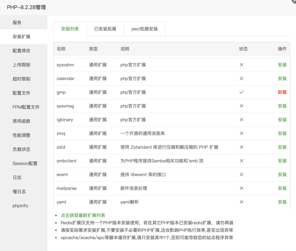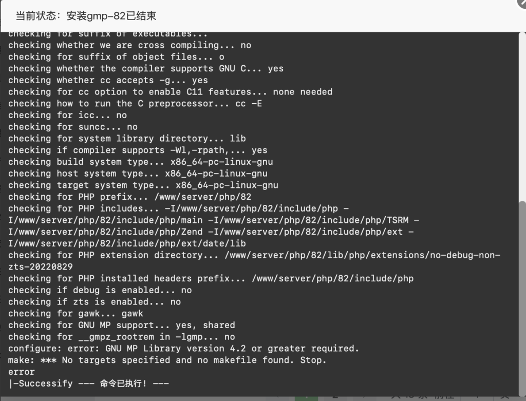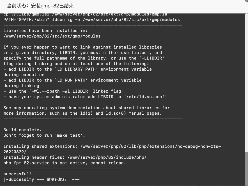 使用软件包管理器手动安装库,然后再在宝塔面板进行相同的操作,此次就可以安装成功,之后重启PHP服务以启用GMP,安装完成。
