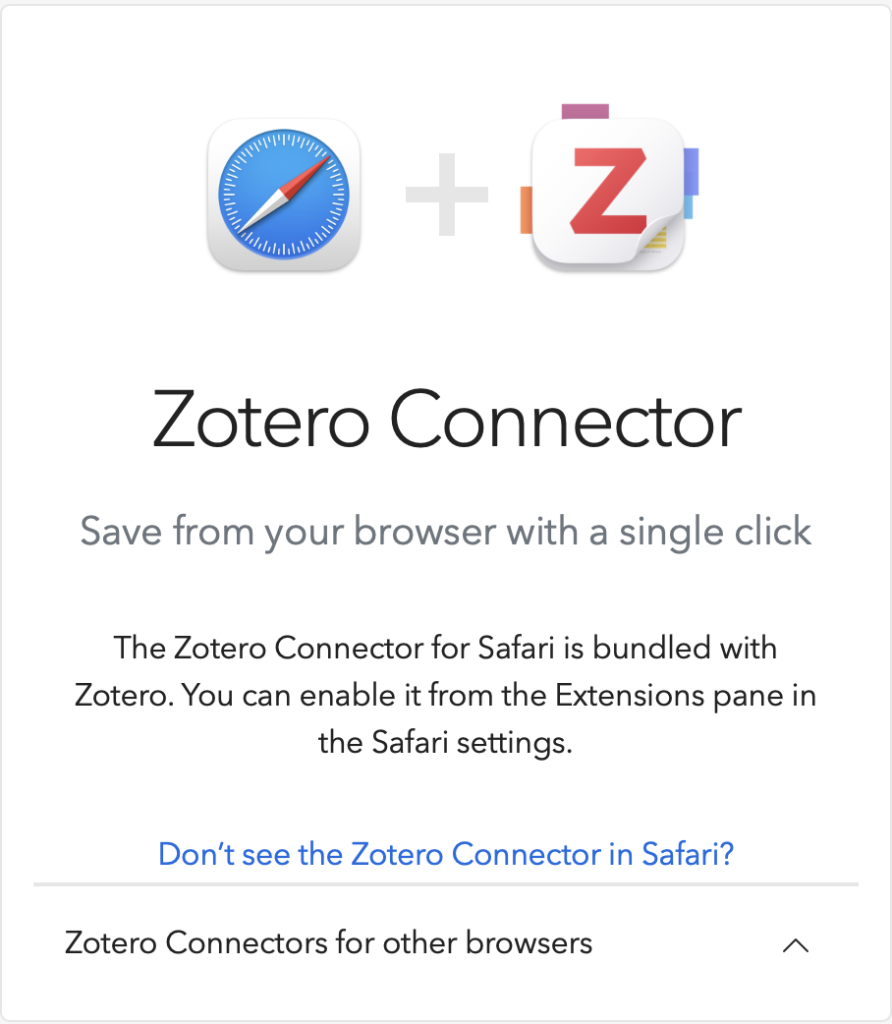 Zotero官网文档显示,Safari是唯一不能直装此插件的浏览器。因此正常情况下,Zotero connector是与主程序本身捆绑并自动添加到Safari的,也不能单独重装插件。